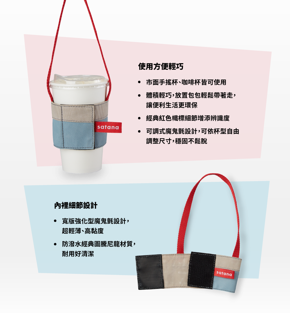 全新杯套系列延續 satana 的防潑水布料,不僅環保,減塑也可以便利生活!