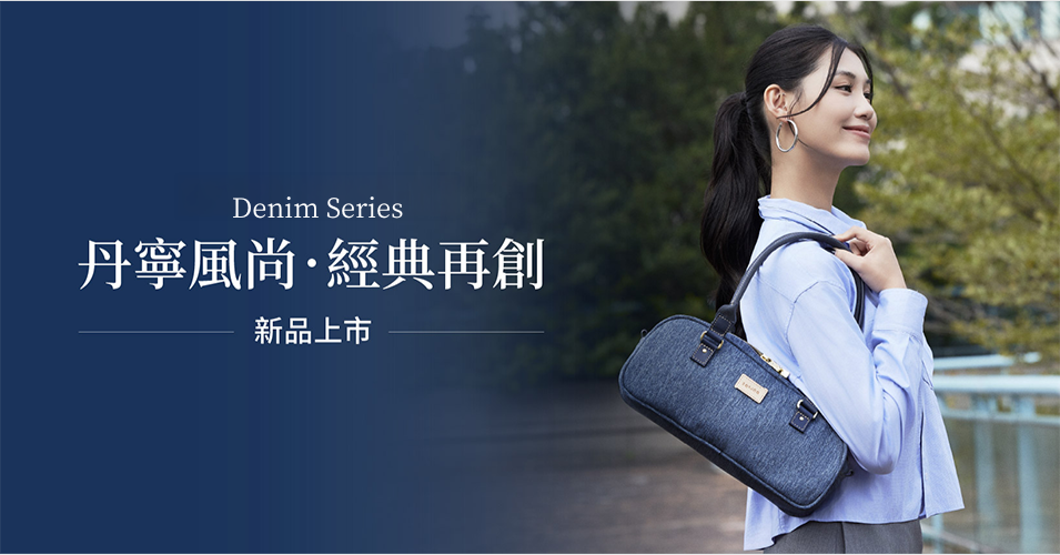 全系列選用 現代科技織法的類丹寧布料,保留丹寧的特殊紋理與質感,極輕量、防潑水,搭配植鞣皮革與質感五金細節,增添機能性並展現層次美感。