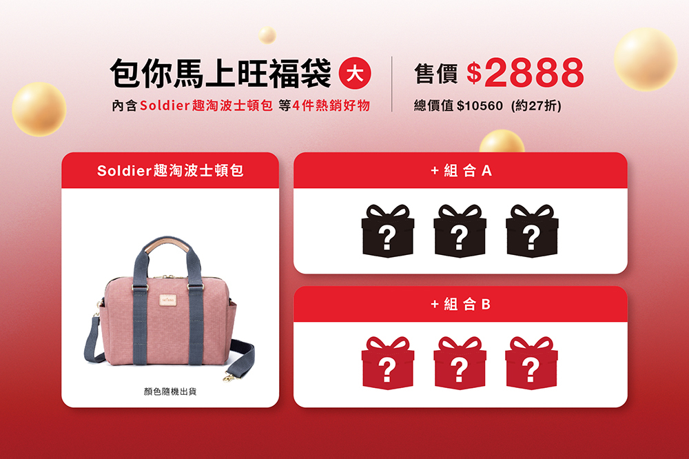 ▪ 內含「Soldier 趣淘波士頓包」、斜背包、零錢包等4件熱銷好物