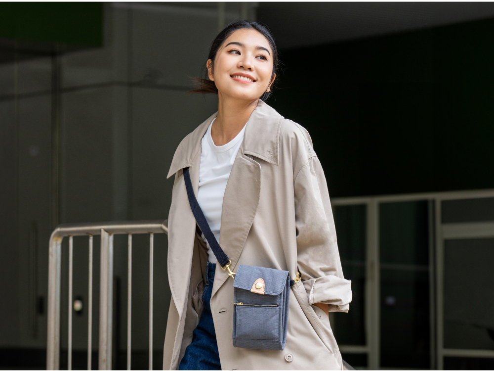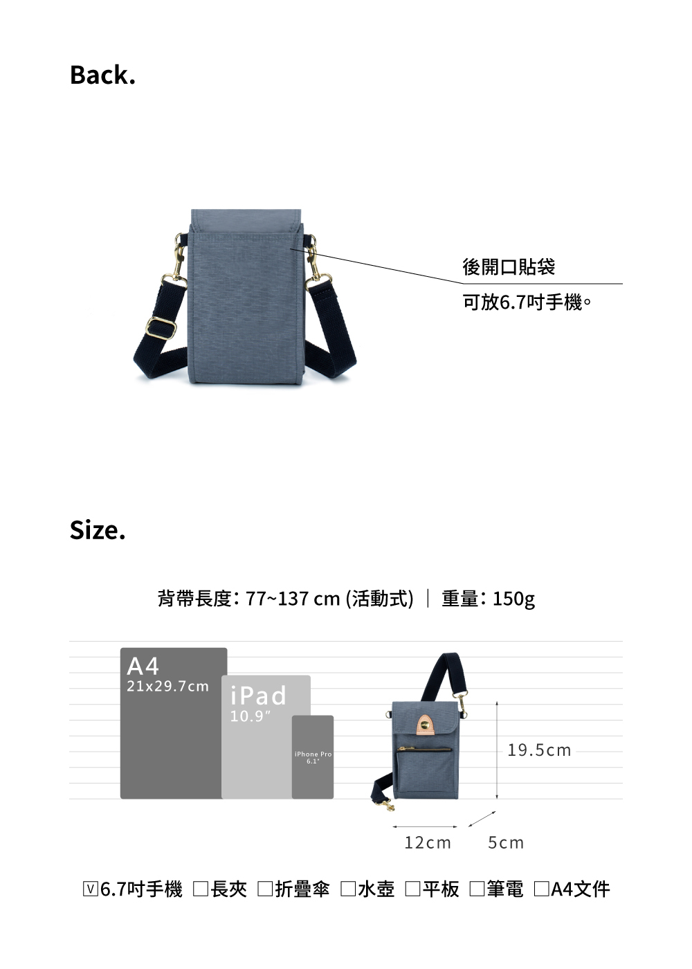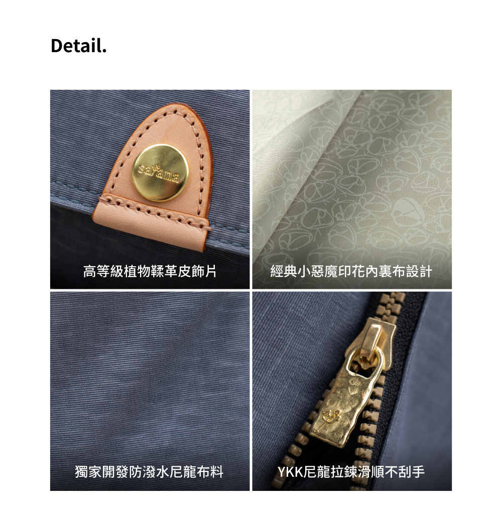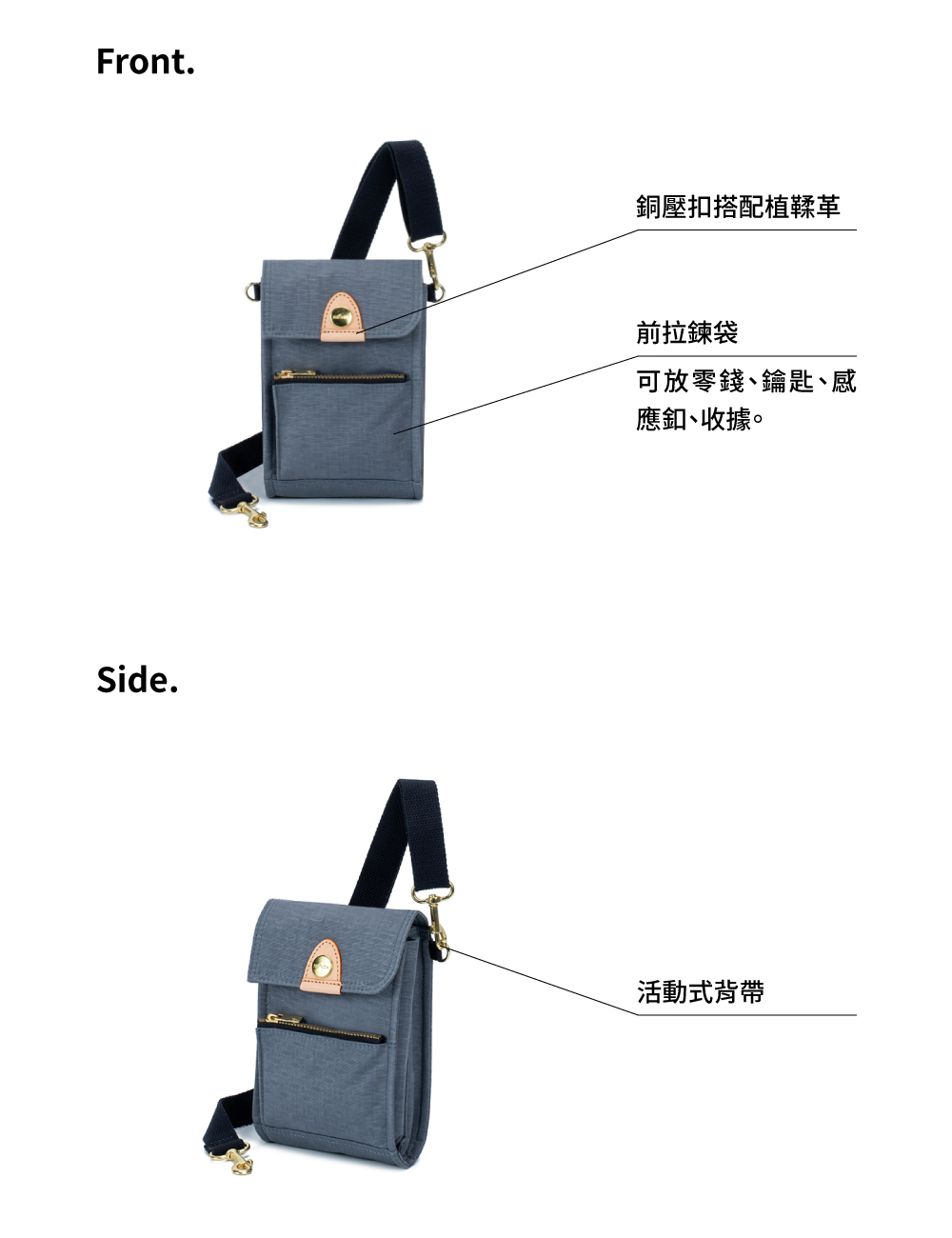 輕便外出的隨身包,經典satana銅釦與植鞣革的搭配,質感的處理呈現職人手感精神,袋蓋的造型右側以大圓弧的曲線設計,俐落精緻、簡約乾淨。