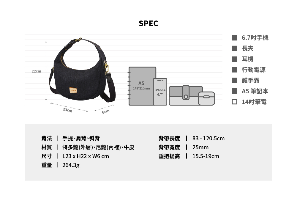 ▪ 可放長夾、6.7吋手機、A5筆記本