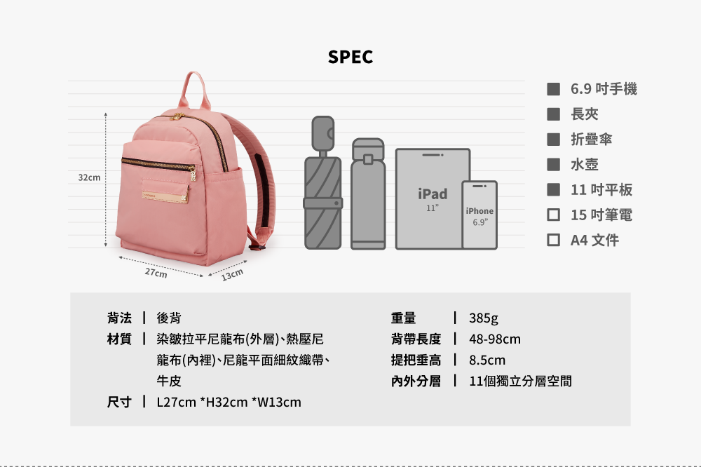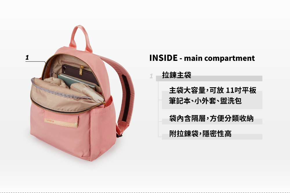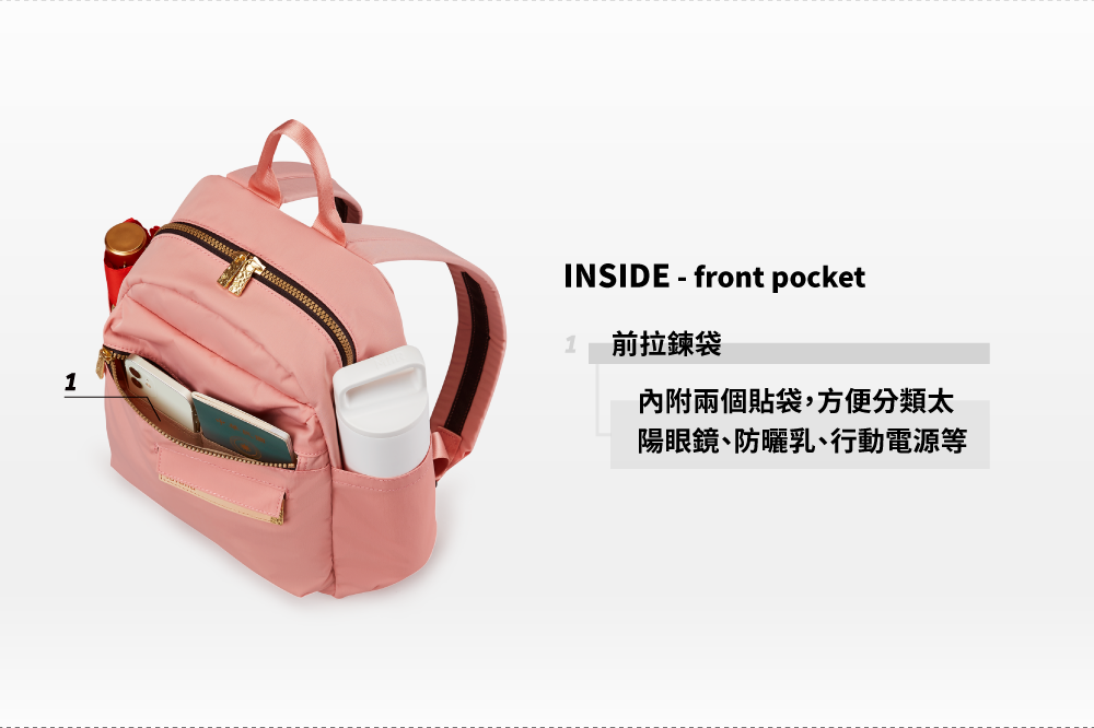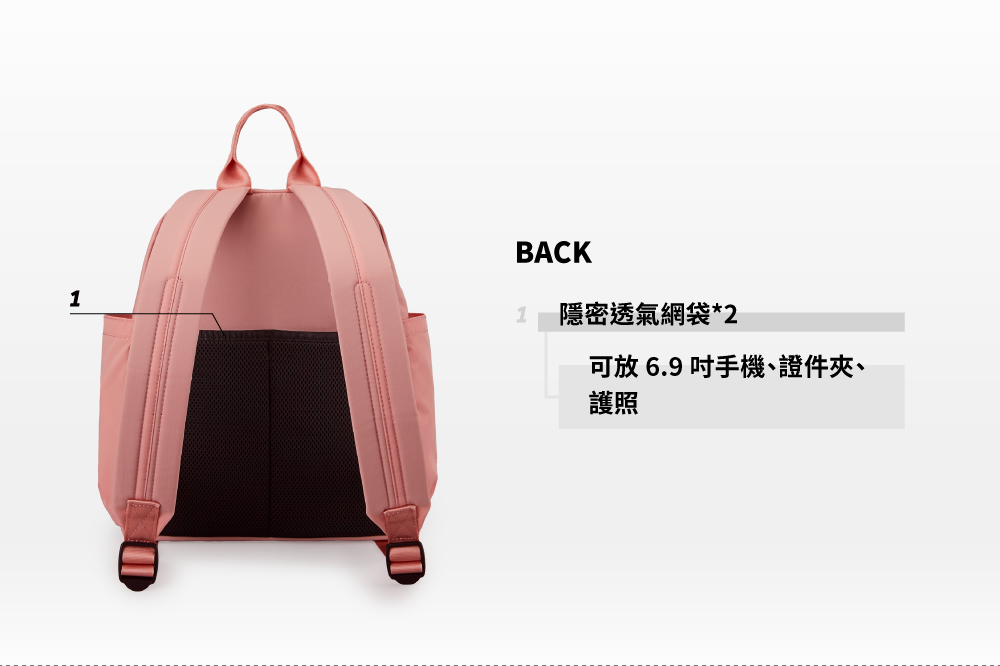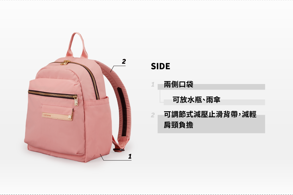 ▪ 兩側外袋獨立空間,可放水瓶雨傘