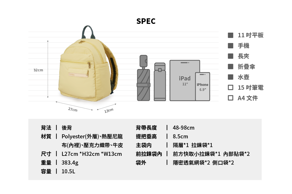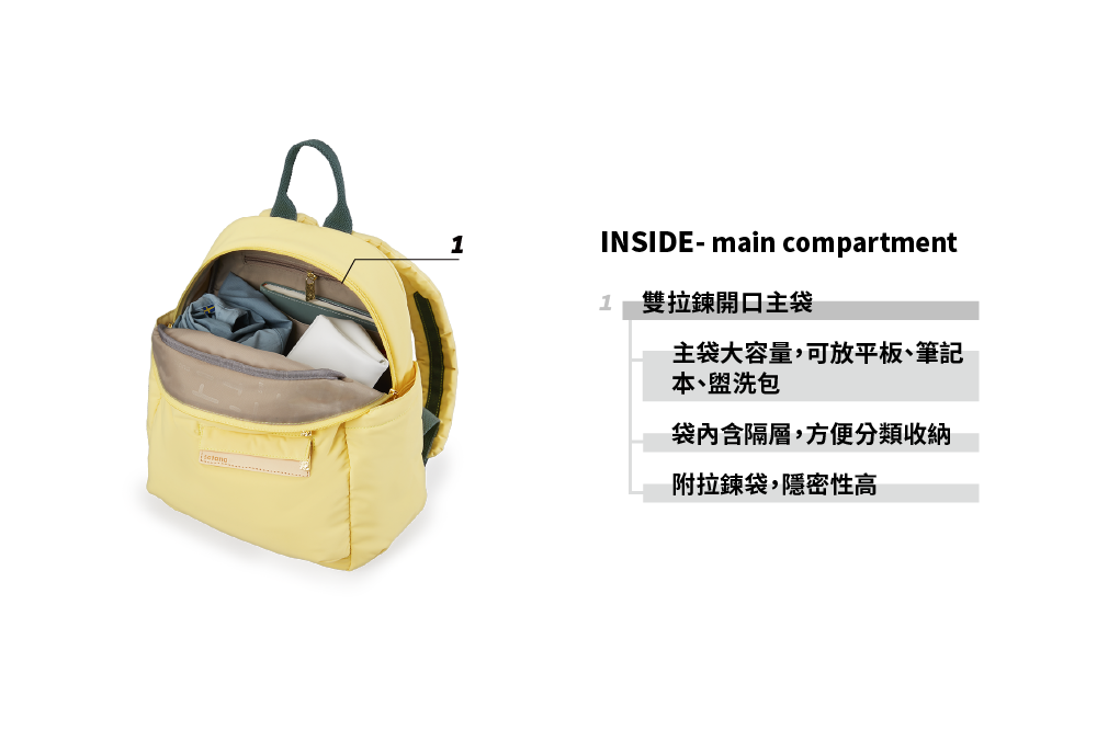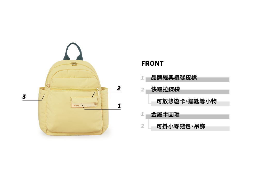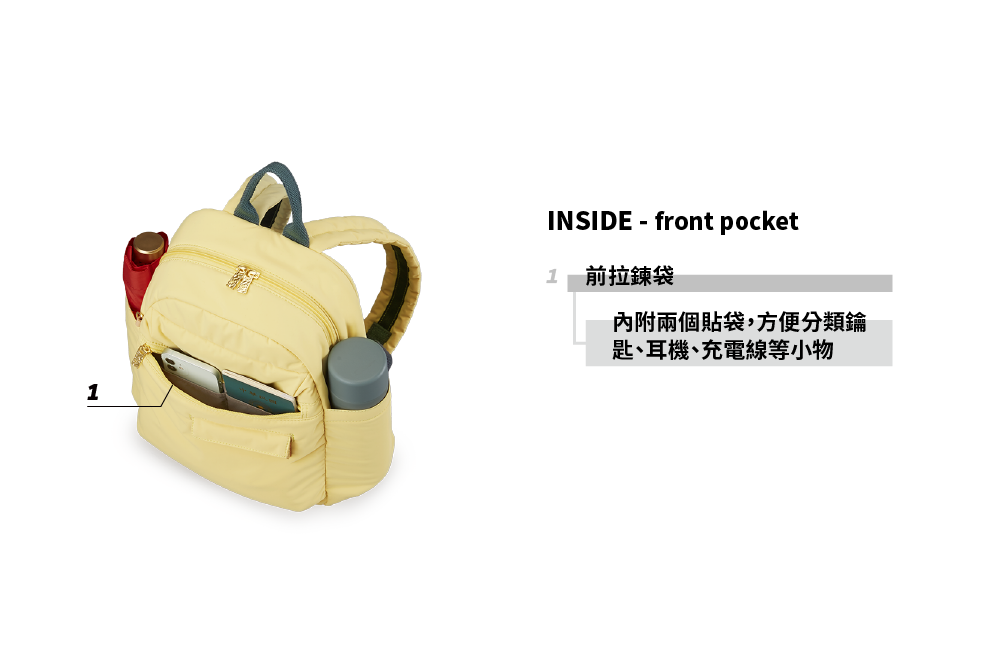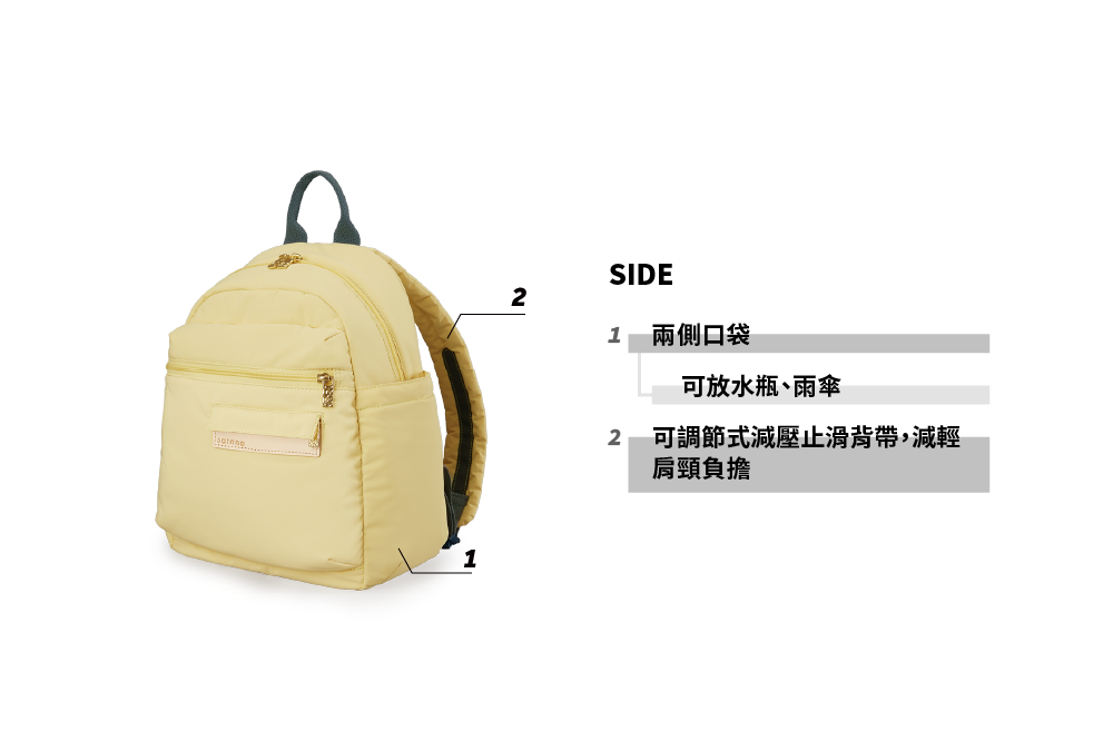 ▪ 兩側外袋獨立空間,可放水瓶雨傘