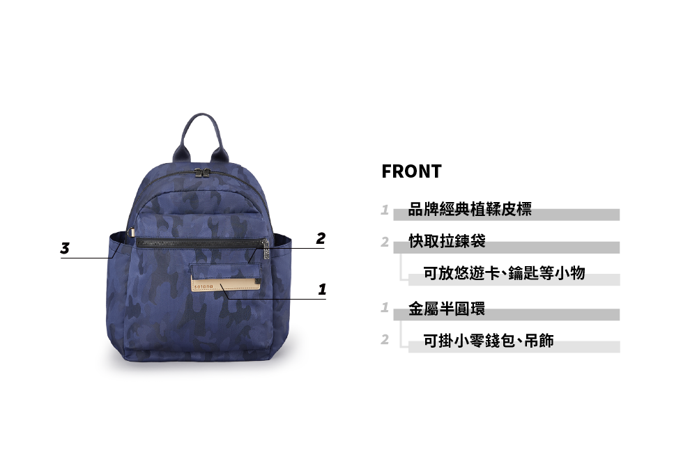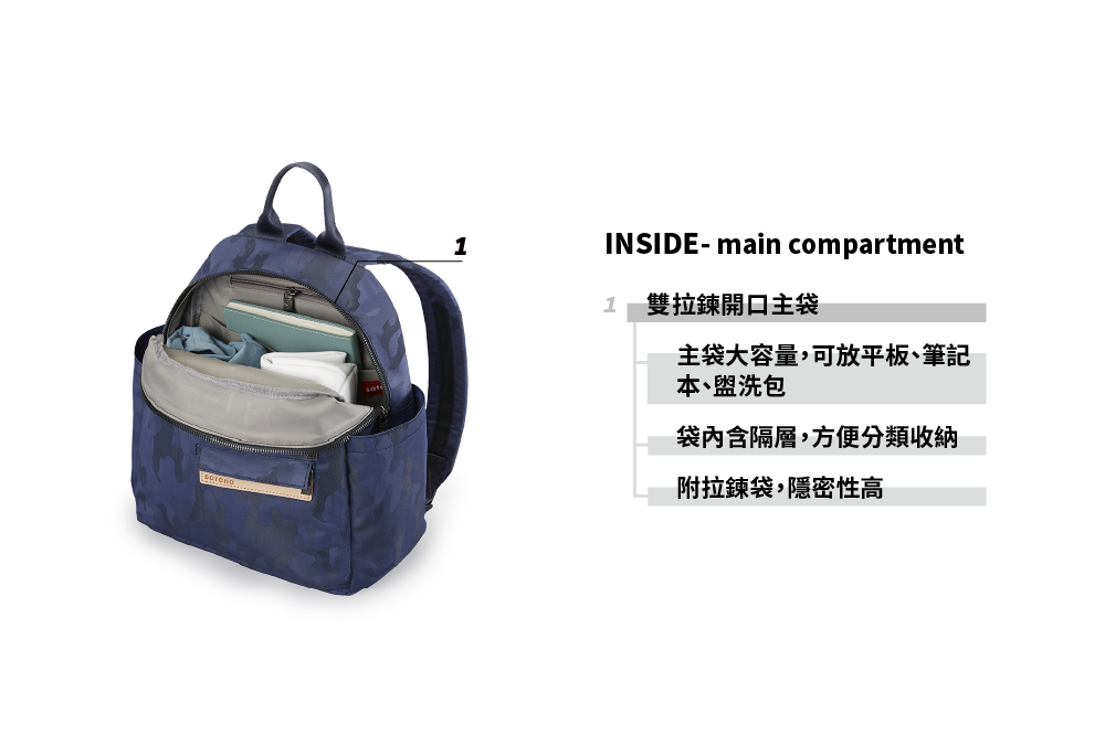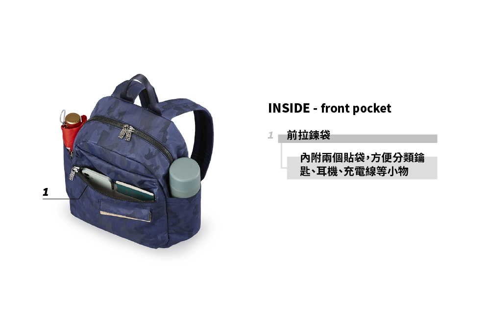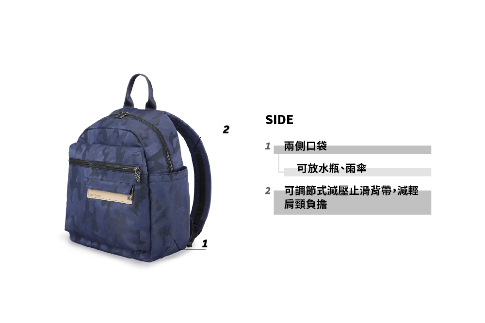 ▪ 兩側外袋獨立空間,可放水瓶雨傘