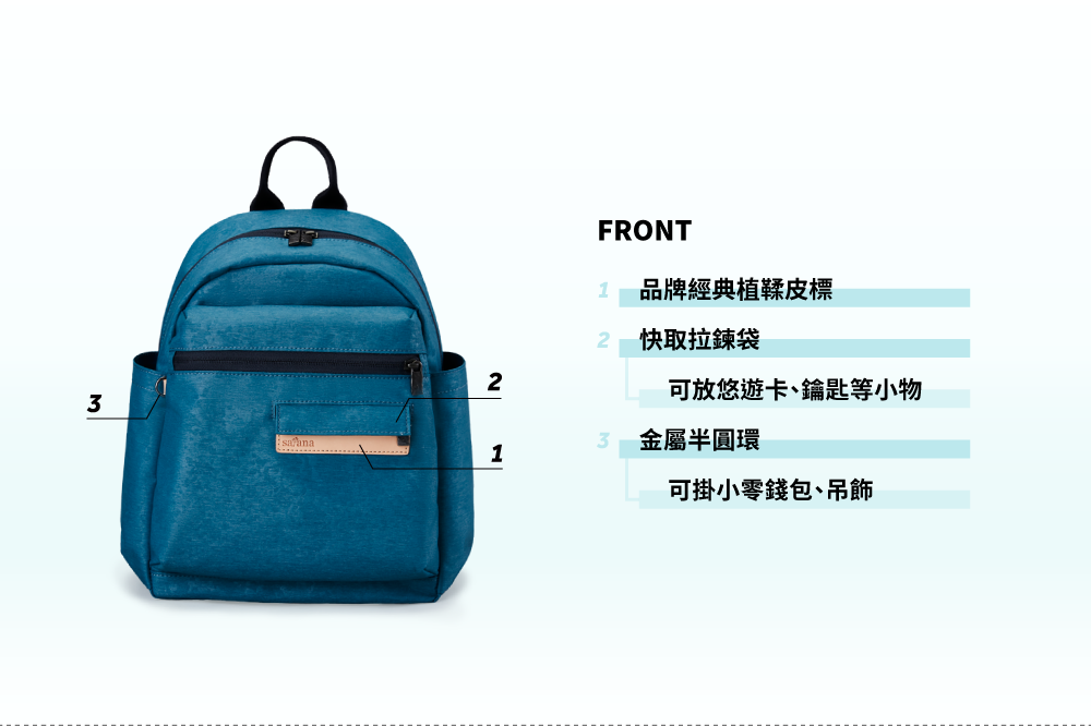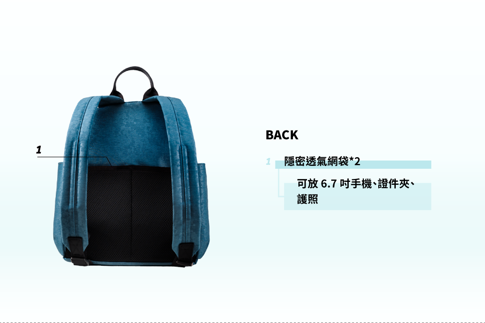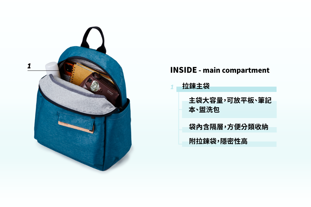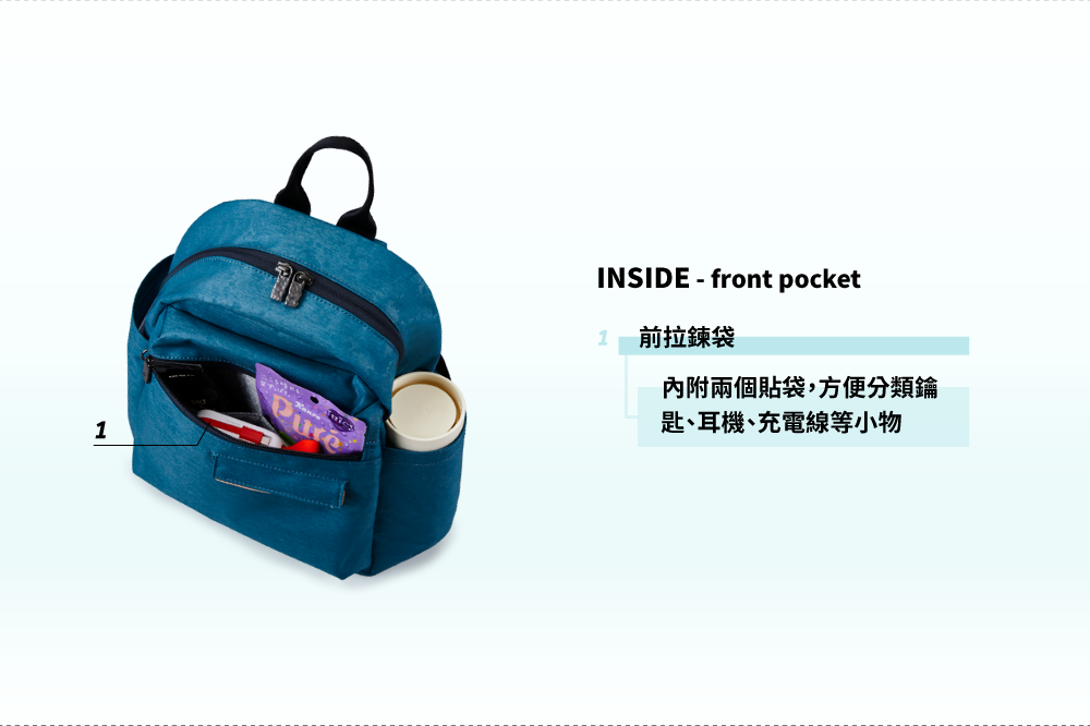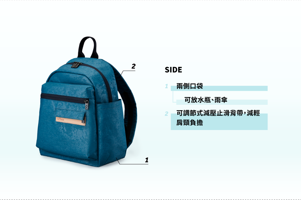 ▪ 兩側外袋獨立空間,可放水瓶雨傘