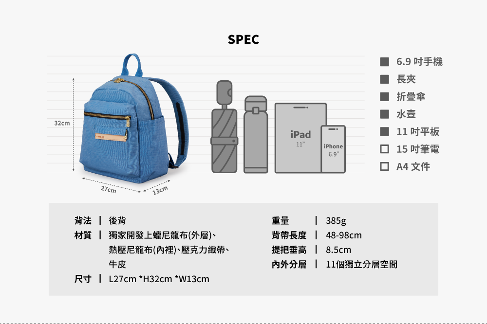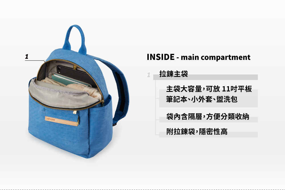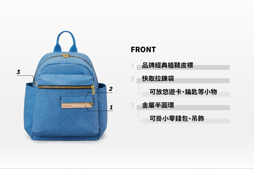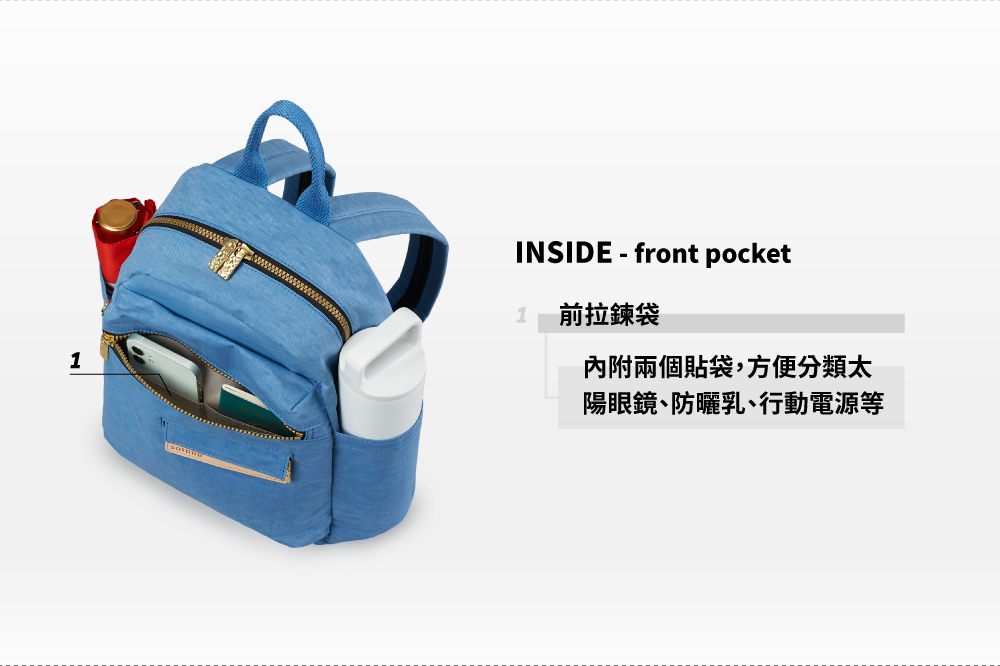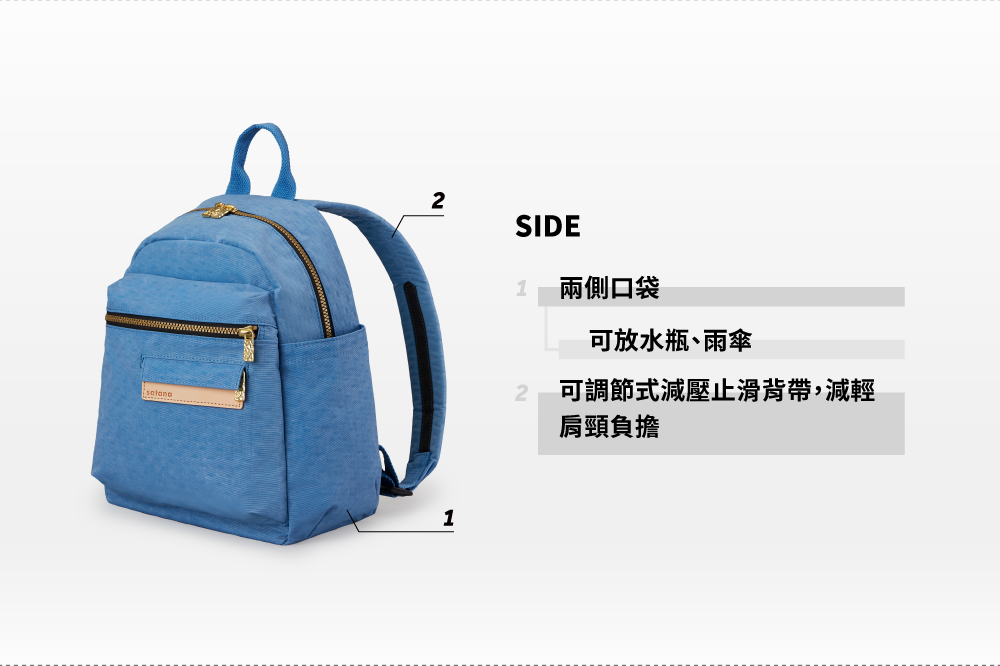 ▪ 兩側外袋獨立空間,可放水瓶雨傘