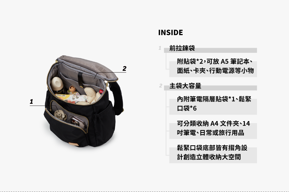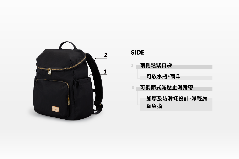 ▪ 兩側鬆緊口袋可放水瓶、雨傘,穩固不滑落