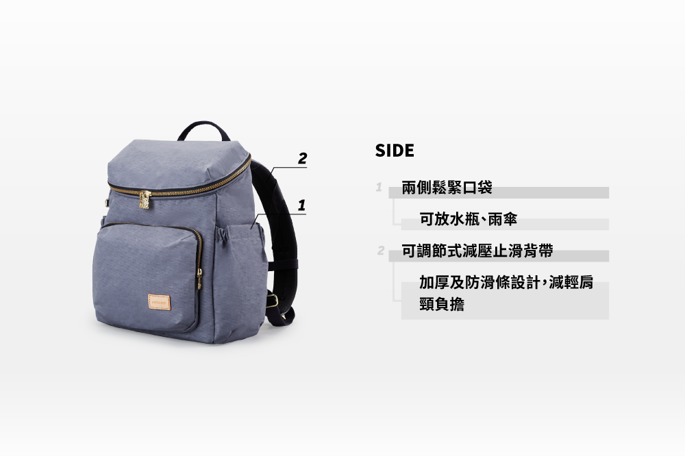 ▪ 兩側鬆緊口袋可放水瓶、雨傘,穩固不滑落