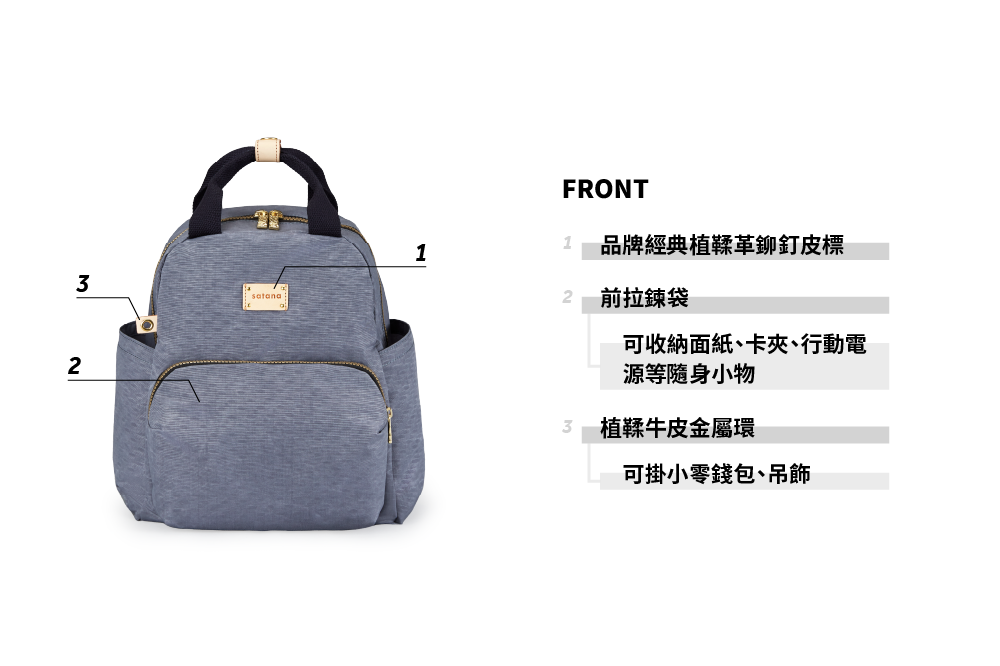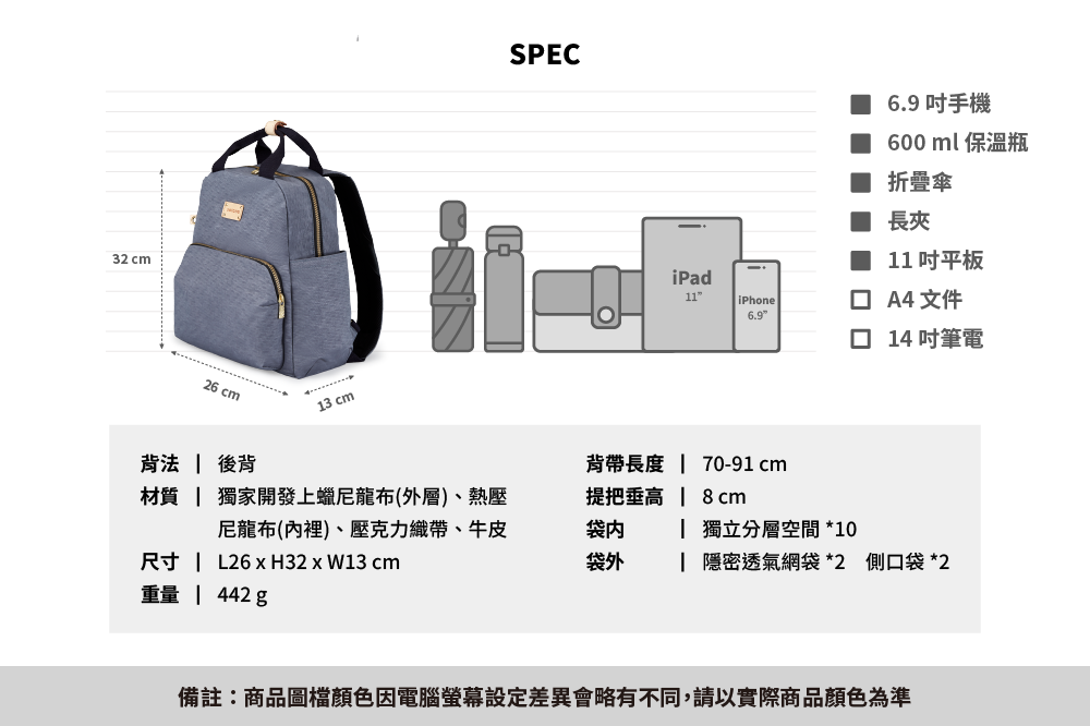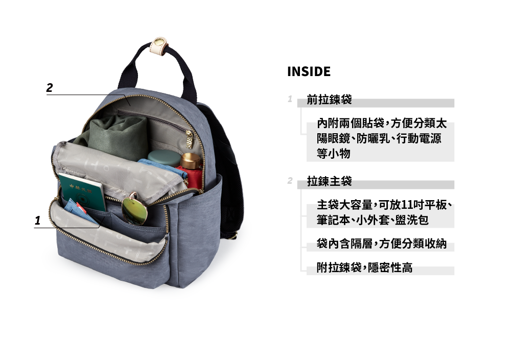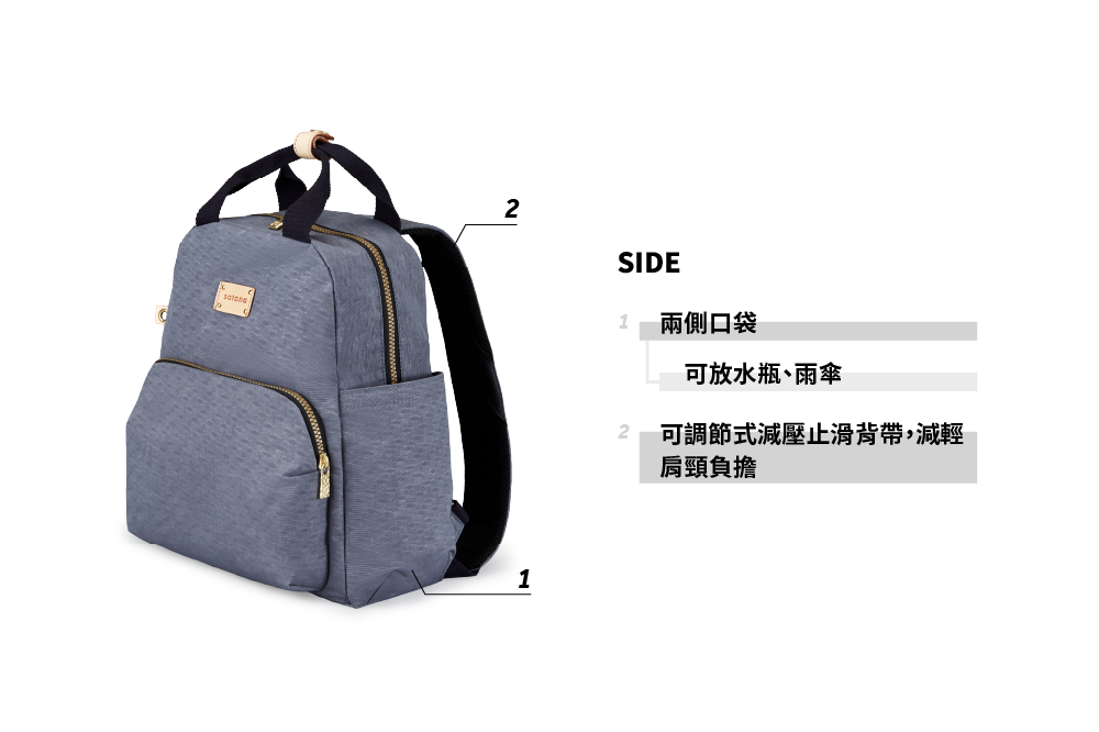 ▪ 兩側外袋獨立空間,可放摺疊傘與600ml保溫瓶