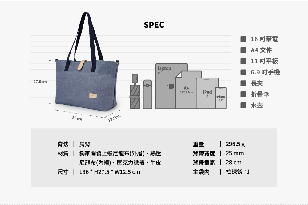 ▪ 獨家開發防潑水尼龍布料