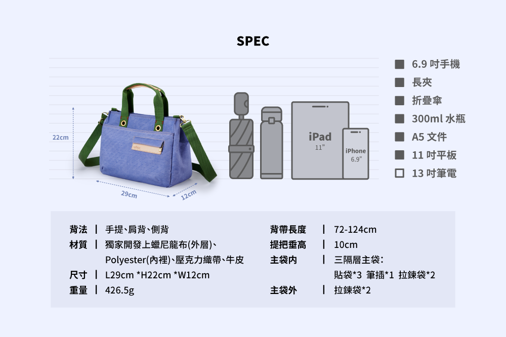 ▪ 可放A5筆記本、11吋平板