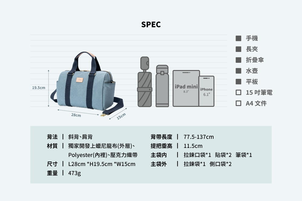 ▪可放A5文件、8.3吋平板