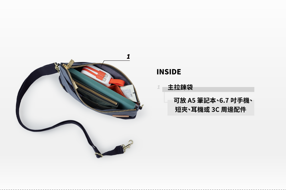 ▪ 主袋可放長夾、A5筆記本