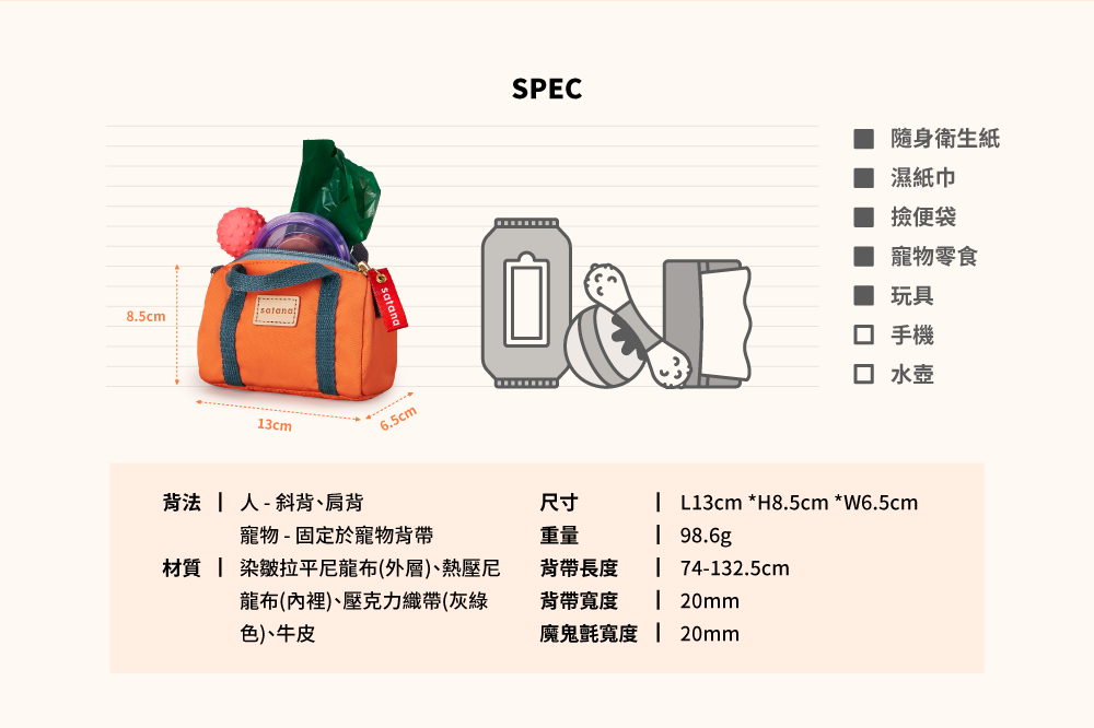 ▪ 主袋可收納寵物零食、撿便袋、錢包、鑰匙等小物
