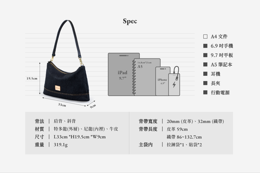 ▪ 可放長夾、9.7 吋平板、6.9 吋手機