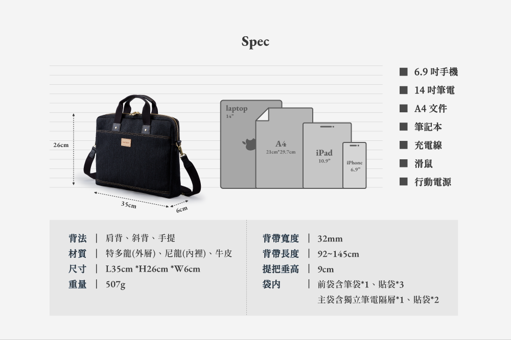 ▪ 前袋使用環保 RCA 尼龍拉鍊,含貼袋*3、筆袋*1
