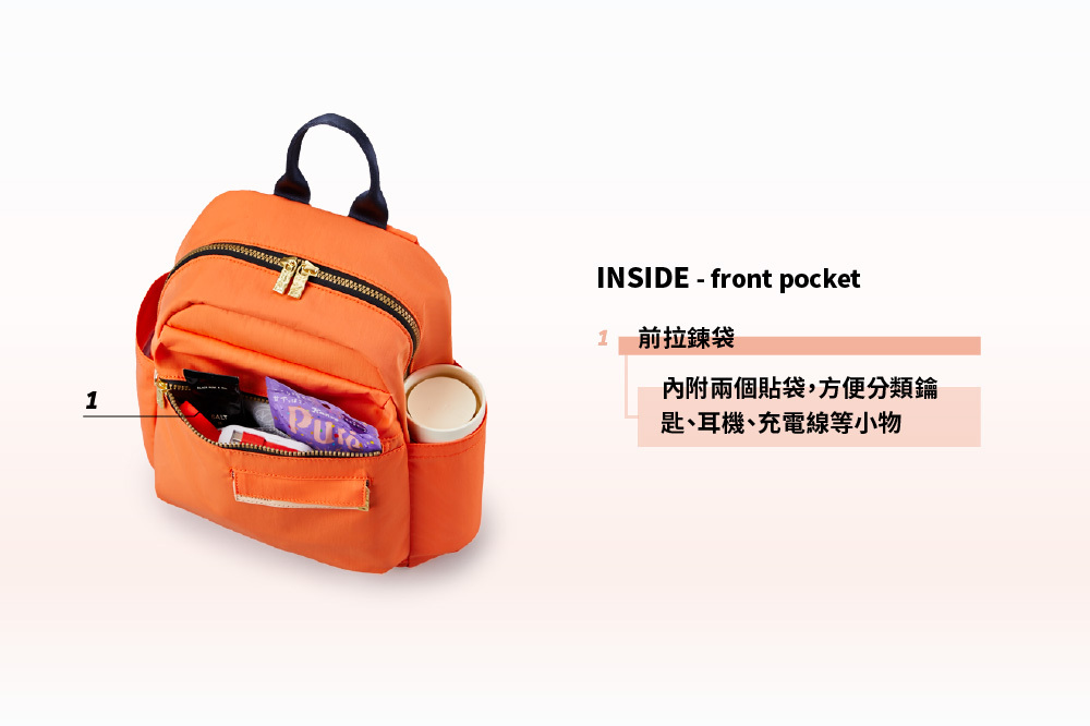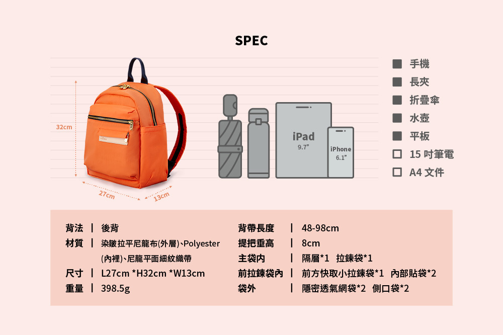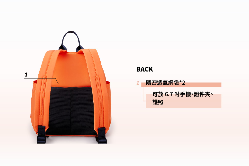 ▪後側隱密透氣網袋,可放錢包手機