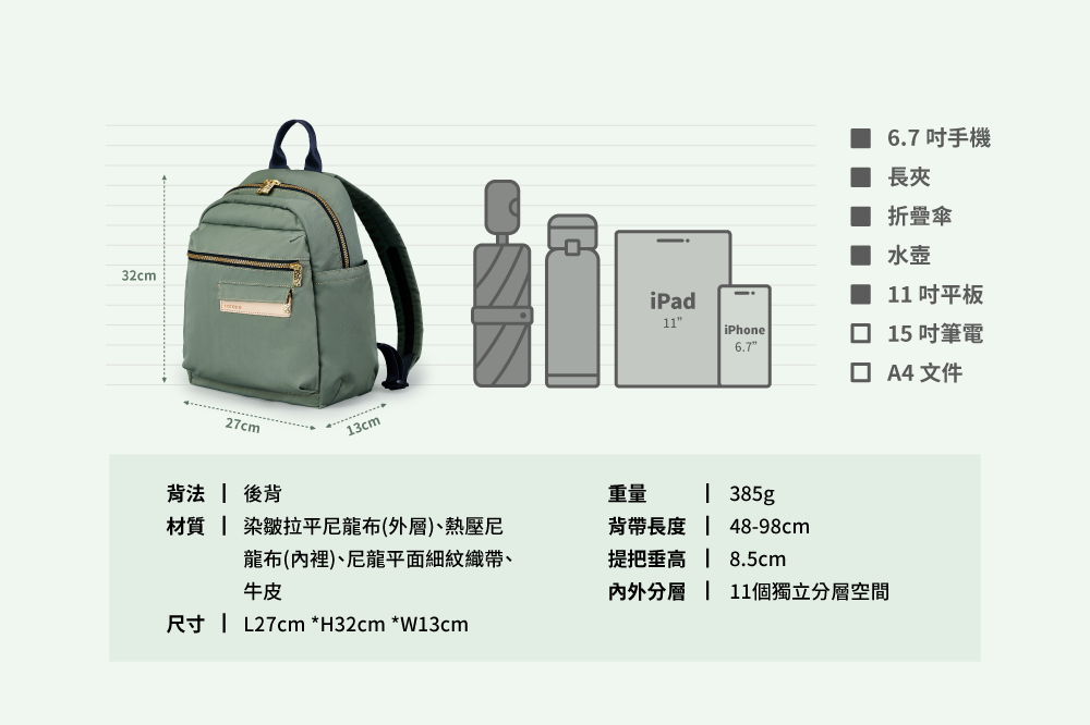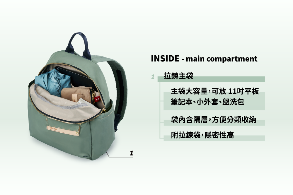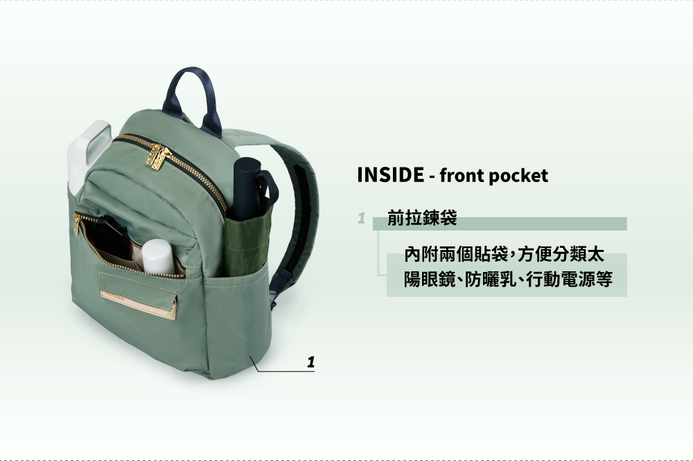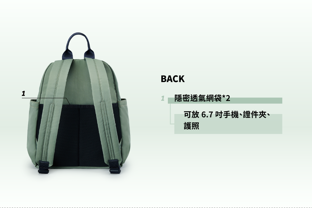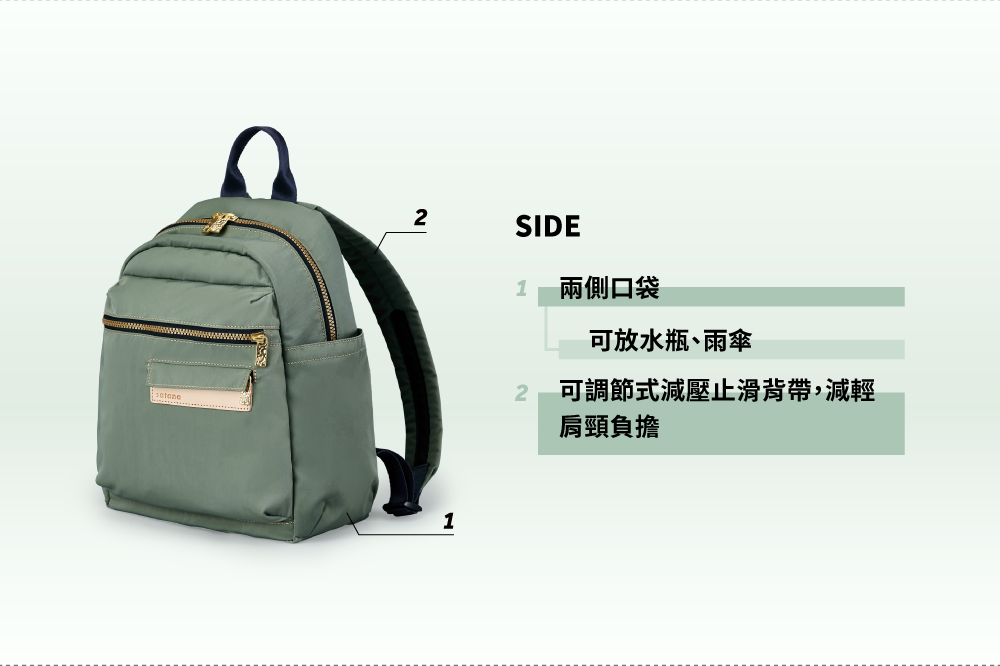 ▪ 兩側外袋獨立空間,可放水瓶雨傘
