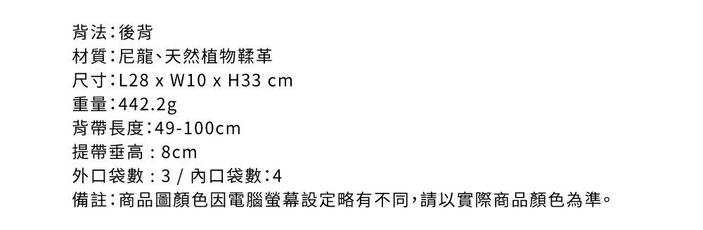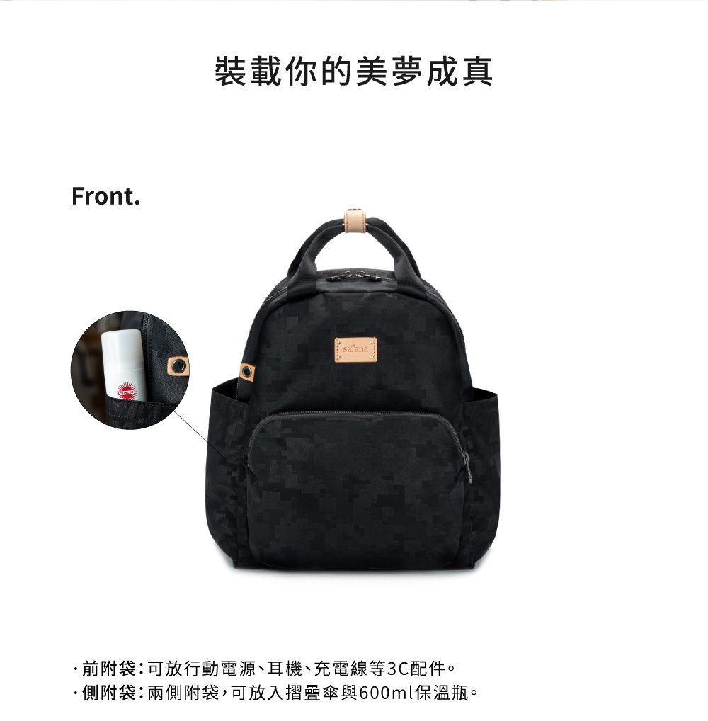 ● 兩側附袋可放摺疊傘與600ml保溫瓶