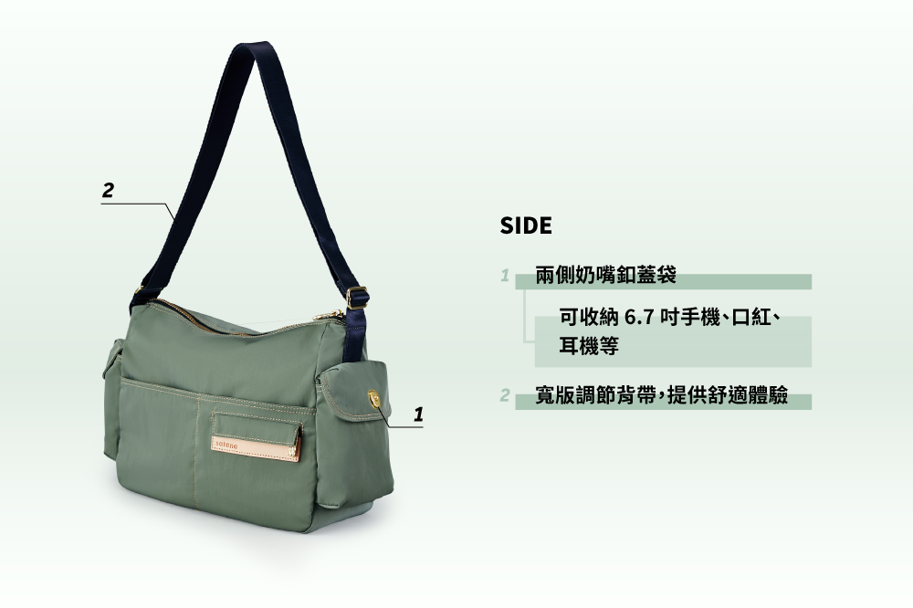 ▪ 兩側奶嘴釦蓋袋,可放6.7吋手機