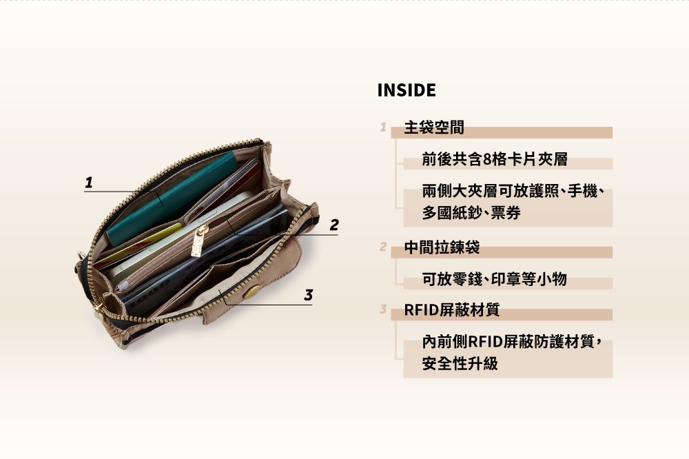 ▪ 主袋夾層可分置紙鈔票券