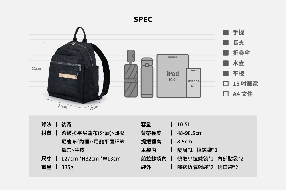 ▪ 兩側外袋獨立空間,可放水瓶雨傘